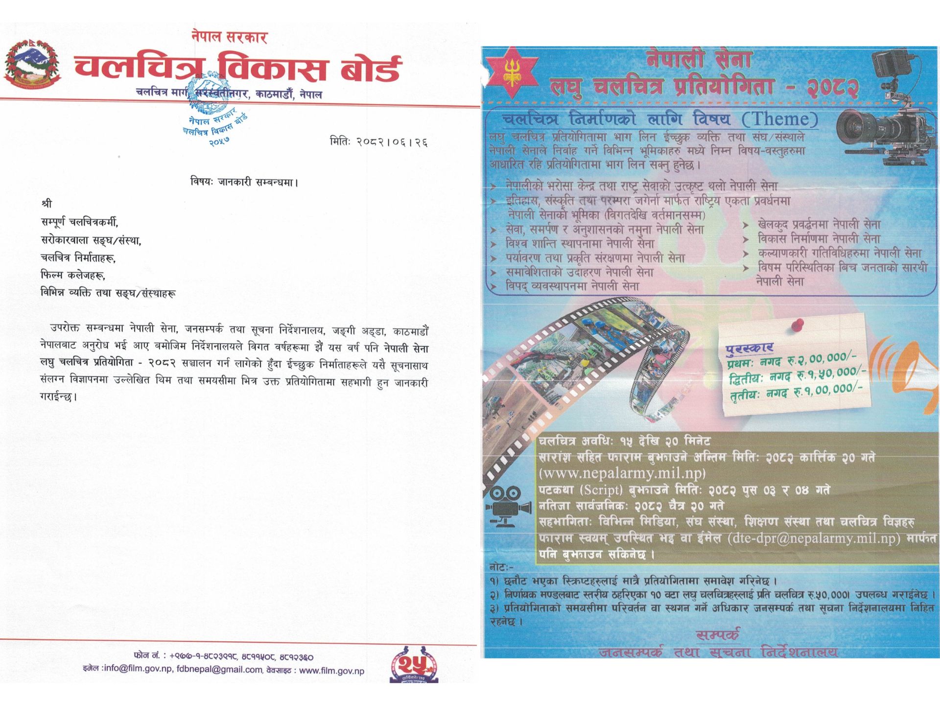 Read Moreनेपाली सेना लघु चलचित्र प्रतियोगिता–२०८२ सम्बन्धमा जानकारी