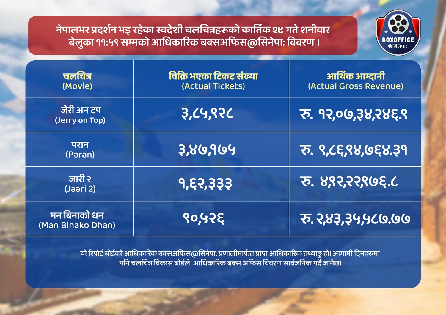 | साप्ताहिक बक्स अफिस रिपोर्ट – मिति २०८२ कार्तिक २९ गते शनिबार, ११ः५९ राति सम्मको आधिकारिक बक्स अफिस रिपोर्ट @सिनेपाः, कलेक्सन
