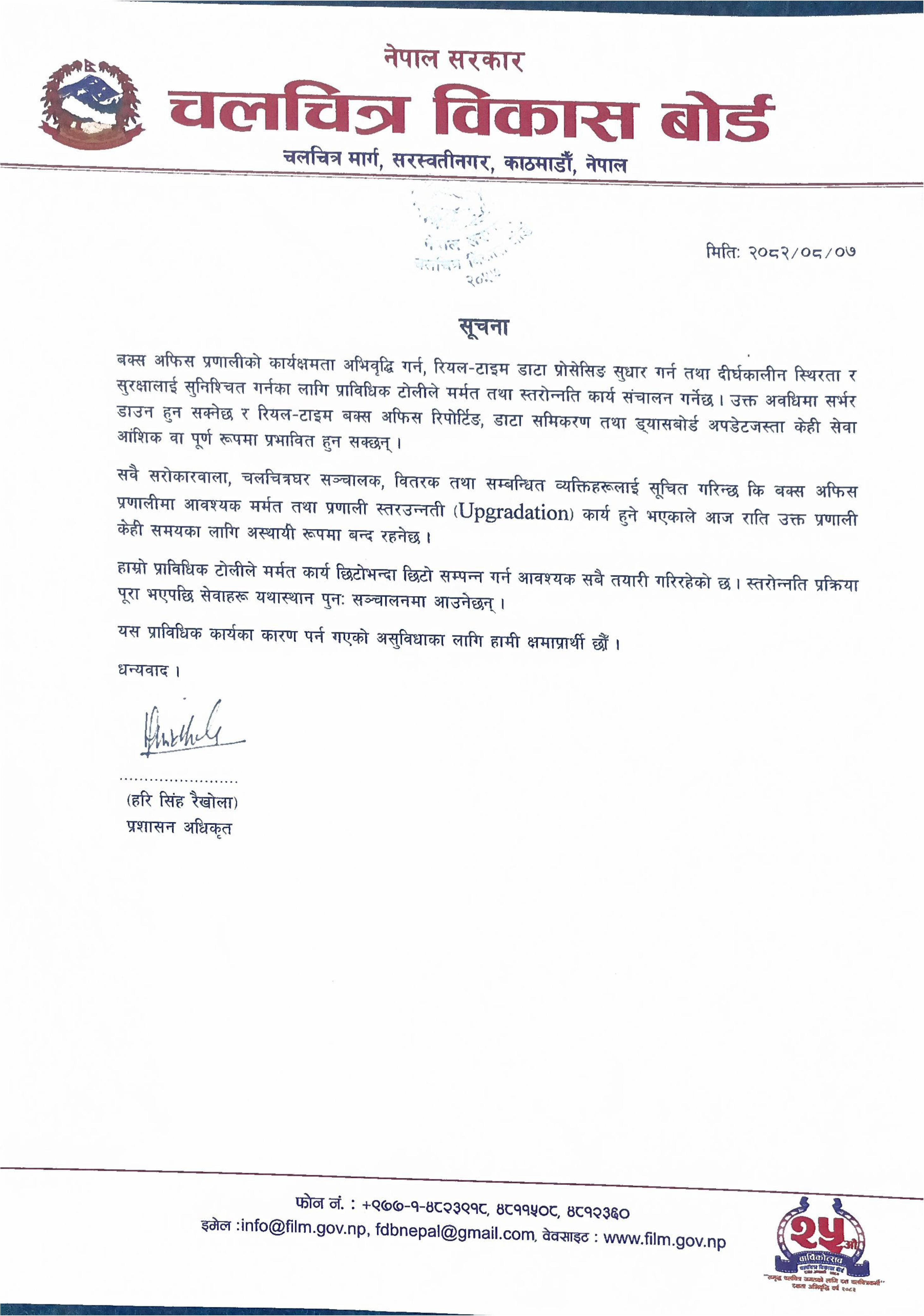 बक्स अफिस व्यवस्थापन प्रणालीमा आवश्यक मर्मत तथा प्रणाली स्तर उन्नती (Upgradation) कार्यको कारणले आज राति बक्स अफिस प्रणालीको सेवा अवरुद्ध हुनसक्ने सुचना ।