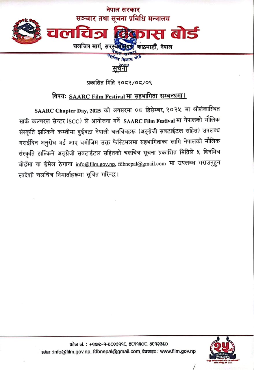 SAARC Chapter Day, 2025 को अवसरमा ०८ डिसेम्बर, २०२५ मा श्रीलंकास्थित सार्क कल्चरल सेन्टर (SCC) ले आयोजना गर्ने  SAARC Film Festival मा नेपालको मौलिक संस्कृति झल्किने कम्तीमा दुईवटा नेपाली चलचित्रहरू (अङ्‍ग्रेजी सबटाईटल सहित) उपलब्ध गराईदिन अनुरोध भई आए बमोजिम उक्त फेस्टिभलमा सहभागिताका लागि नेपालको मौलिक संस्कृति झल्किने अङ्‍ग्रेजी सबटाईटल सहितको चलचित्र सूचना प्रकाशित मितिले ५ दिनभित्र बोर्डमा वा ईमेल ठेगाना info@film.gov.np, fdbnepal@gmail.com मा उपलब्ध गराउनुहुन स्वदेशी चलचित्र निमार्ताहरूमा सूचित गरिन्छ।