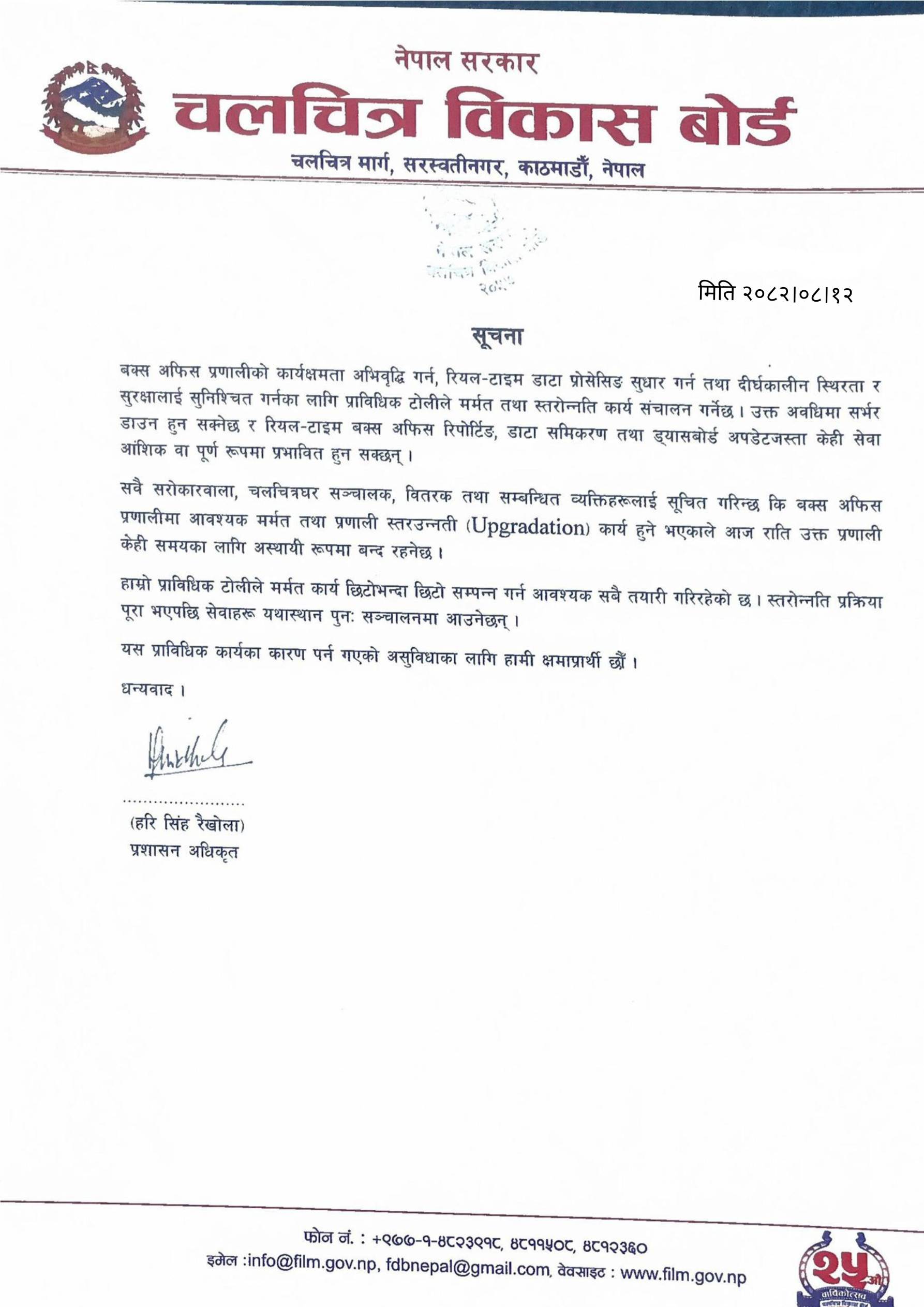 बक्स अफिस व्यवस्थापन प्रणालीमा आवश्यक मर्मत तथा प्रणाली स्तर उन्नती (Upgradation) कार्यको कारणले आज राति बक्स अफिस प्रणालीको सेवा अवरुद्ध हुनसक्ने सुचना ।