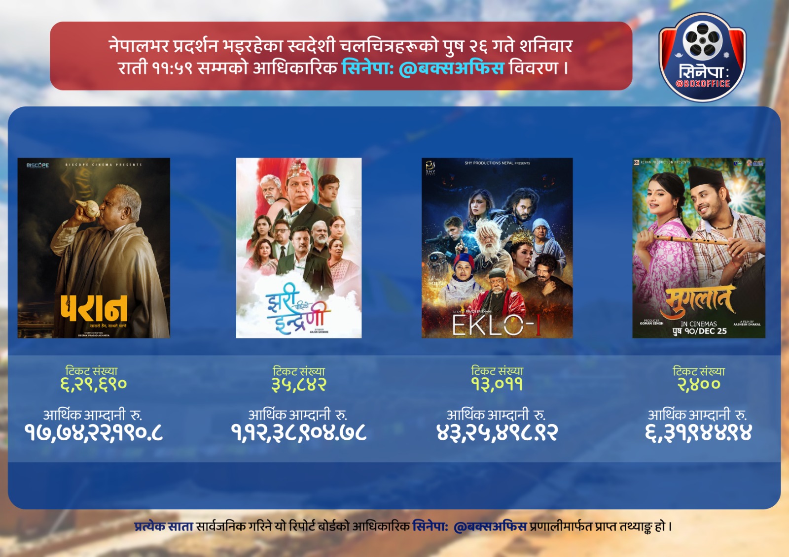 साप्ताहिक बक्स अफिस रिपोर्ट – मिति २०८२ पुष २६ गते शनिबार, ११ः५९ राति सम्मको आधिकारिक बक्स अफिस रिपोर्ट @सिनेपाः, बक्सअफिस कलेक्सन