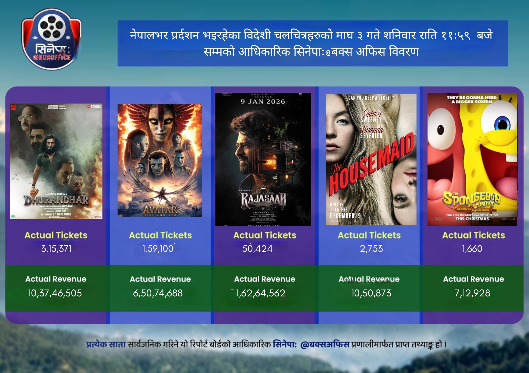 | साप्ताहिक बक्स अफिस रिपोर्ट – मिति २०८२ माघ ३ गते शनिबार, ११ः५९ राति सम्मको आधिकारिक बक्स अफिस रिपोर्ट सिनेपाः@ बक्सअफिस कलेक्सन