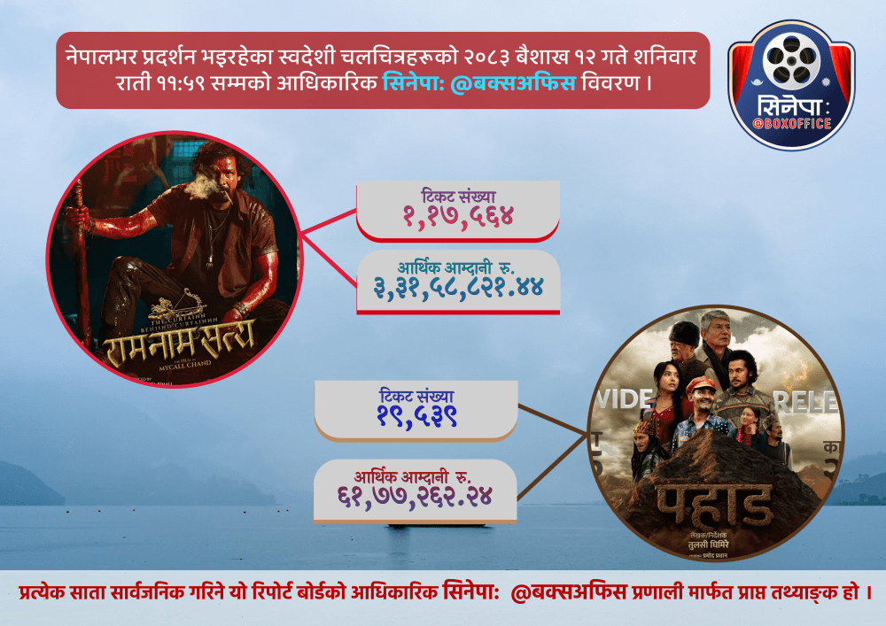 साप्ताहिक स्वदेशी चलचित्रको बक्स अफिस रिपोर्ट – मिति २०८३ बैशाख १२ गते शनिबार, ११ः५९ राति सम्मको आधिकारिक बक्स अफिस रिपोर्ट सिनेपाः@ बक्सअफिस कलेक्सन
