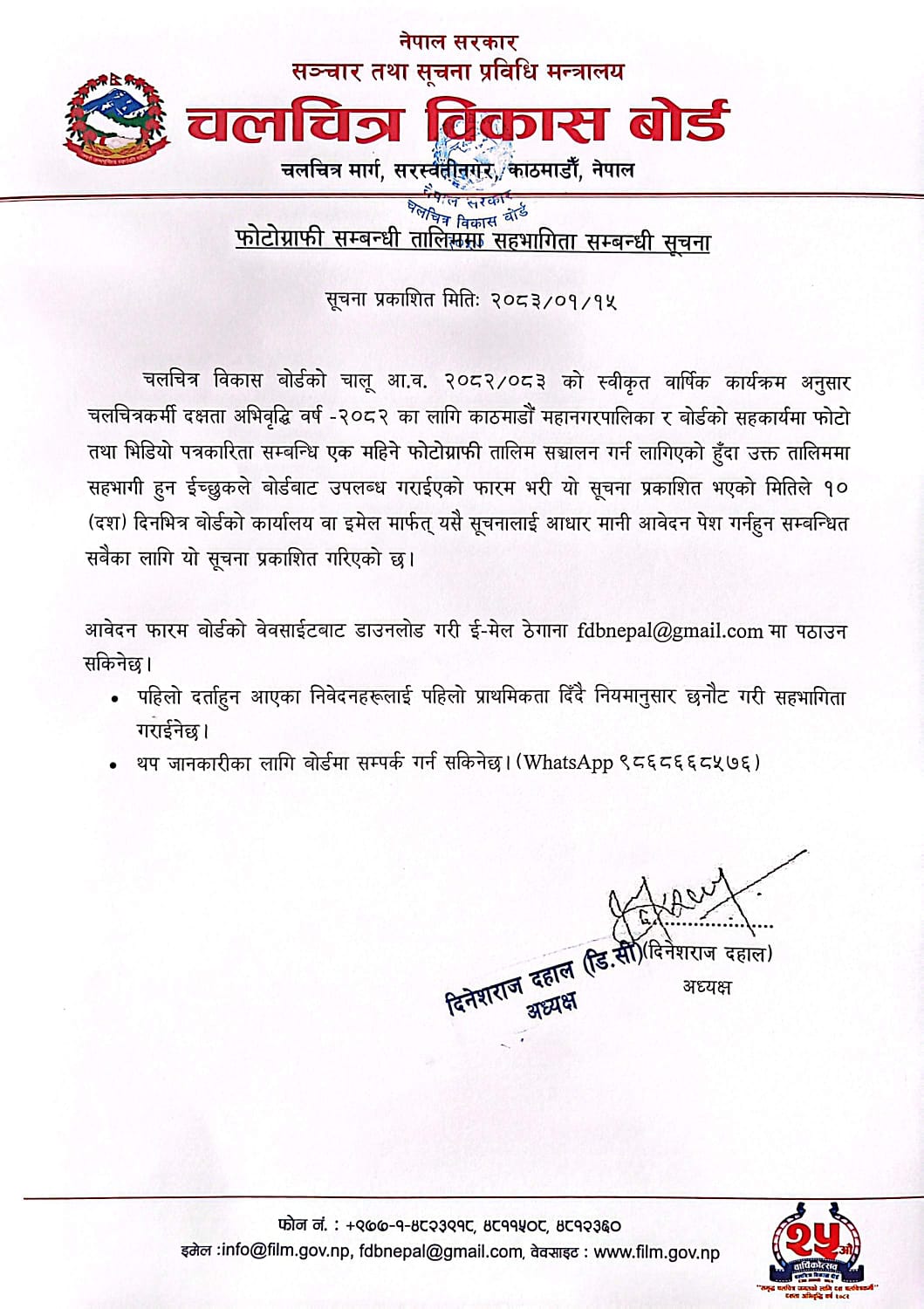 चलचित्र विकास बोर्डको चालू आ.व. २०८२/०८३ को स्वीकृत वार्षिक कार्यक्रम अनुसार चलचित्रकर्मी दक्षता अभिवृद्धि वर्ष -२०८२ का लागि काठमाडौँ महानगरपालिका र बोर्डको सहकार्यमा फोटो तथा भिडियो पत्रकारिता सम्बन्धि एक महिने फोटोग्राफी तालिम सञ्चालन गर्न लागिएको हुँदा उक्त तालिममा सहभागी हुन ईच्छुकले बोर्डबाट उपलब्ध गराईएको फारम भरी यो सूचना प्रकाशित भएको मितिले १० (दश) दिनभित्र बोर्डको कार्यालय वा इमेल मार्फत् यसै सूचनालाई आधार मानी आवेदन पेश गर्नहुन सम्बन्धित सबैका लागि यो सूचना प्रकाशित गरिएको छ।