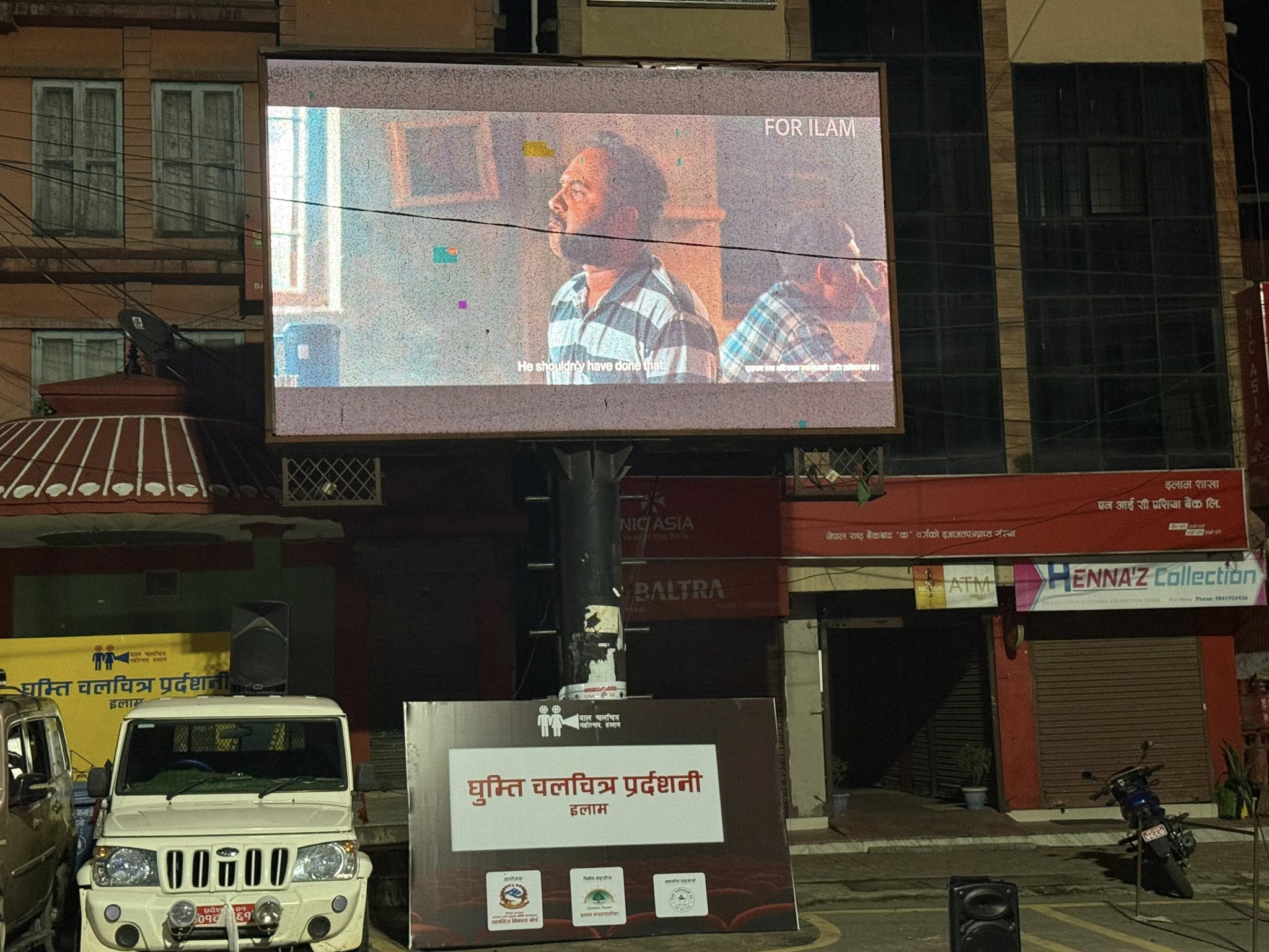 चलचित्र विकास बोर्डको आयोजनामा पछिल्लो साता ‘घुम्ती चलचित्र प्रदर्शनी’ अन्तर्गत सुपरहिट नेपाली चलचित्र ‘अन्जिला’ इलाम बजारको चोकमा रहेको ठुलो एलईडी स्क्रिनमार्फत प्रदर्शन गरिएको छ।