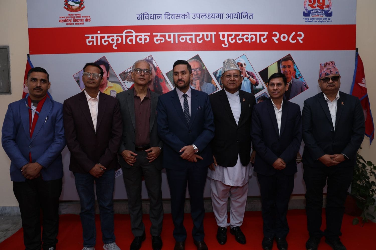 संविधान दिवस २०८२को अवसरमा चलचित्र विकास बोर्डले  आजसामाजिक तथा सांस्कृतिक रूपान्तरणमा उल्लेखनीय योगदान पुर्याउने १५ जना चलचित्रकर्मीलाई माननीय मन्त्री जगदीश खरेलज्यू तथा श्रीमान सचिव राधिका अर्यालज्यूको समुपस्थितिमा “सांस्कृतिक रूपान्तरण  पुरस्कार” प्रदान गरिएको छ ।