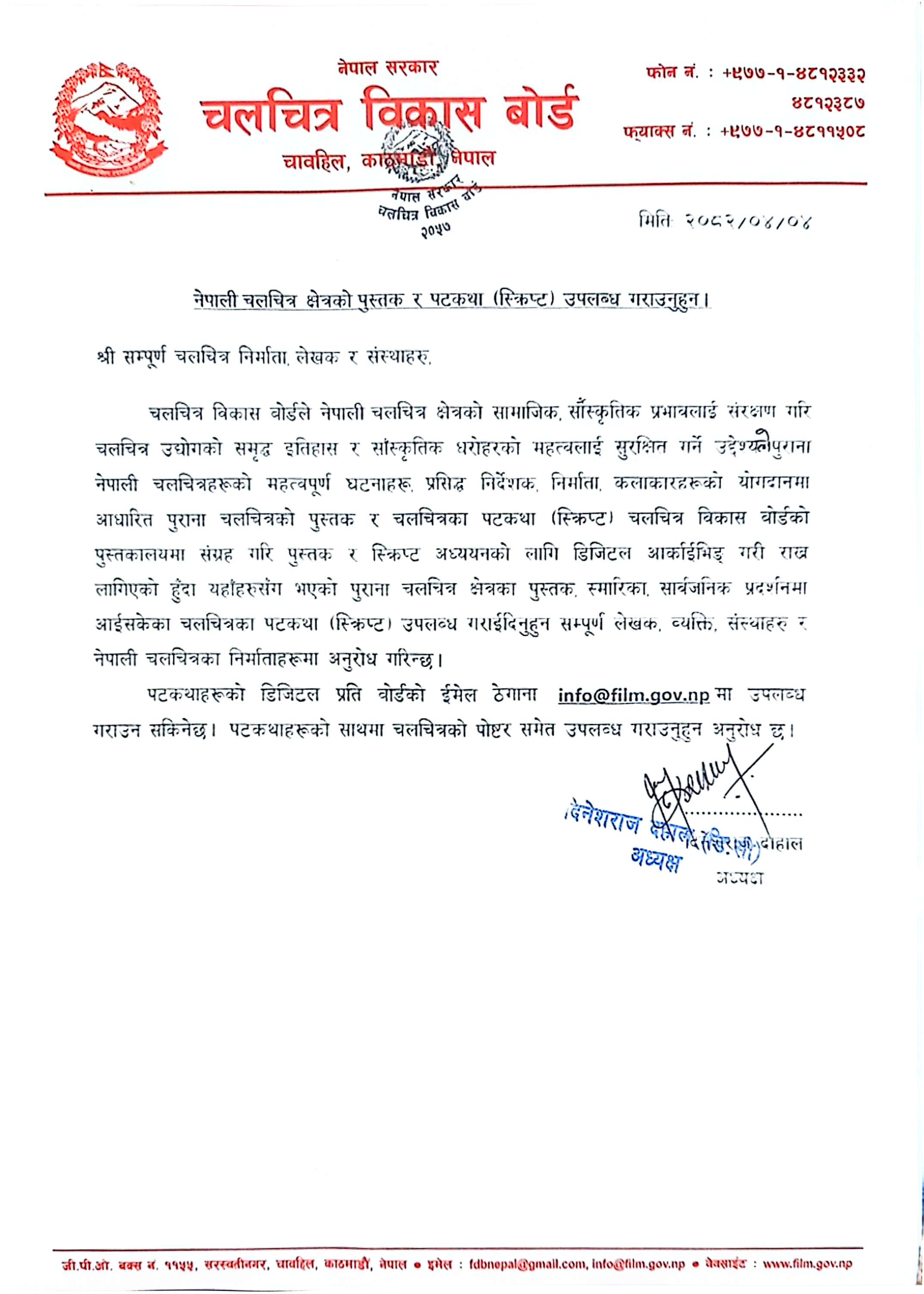 नेपाली चलचित्र क्षेत्रका पुस्तक र चलचित्र स्क्रिप्ट (पटकथा) उपलब्ध गराउने सम्बन्धी सूचना