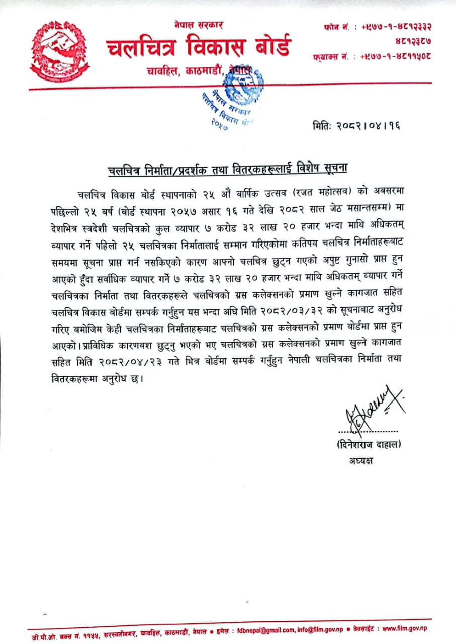 चलचित्र छात्रवृत्ति सम्बन्धी सूचना (२०८२।०४।१८ आईतबार, गोरखापत्र दैनिक)