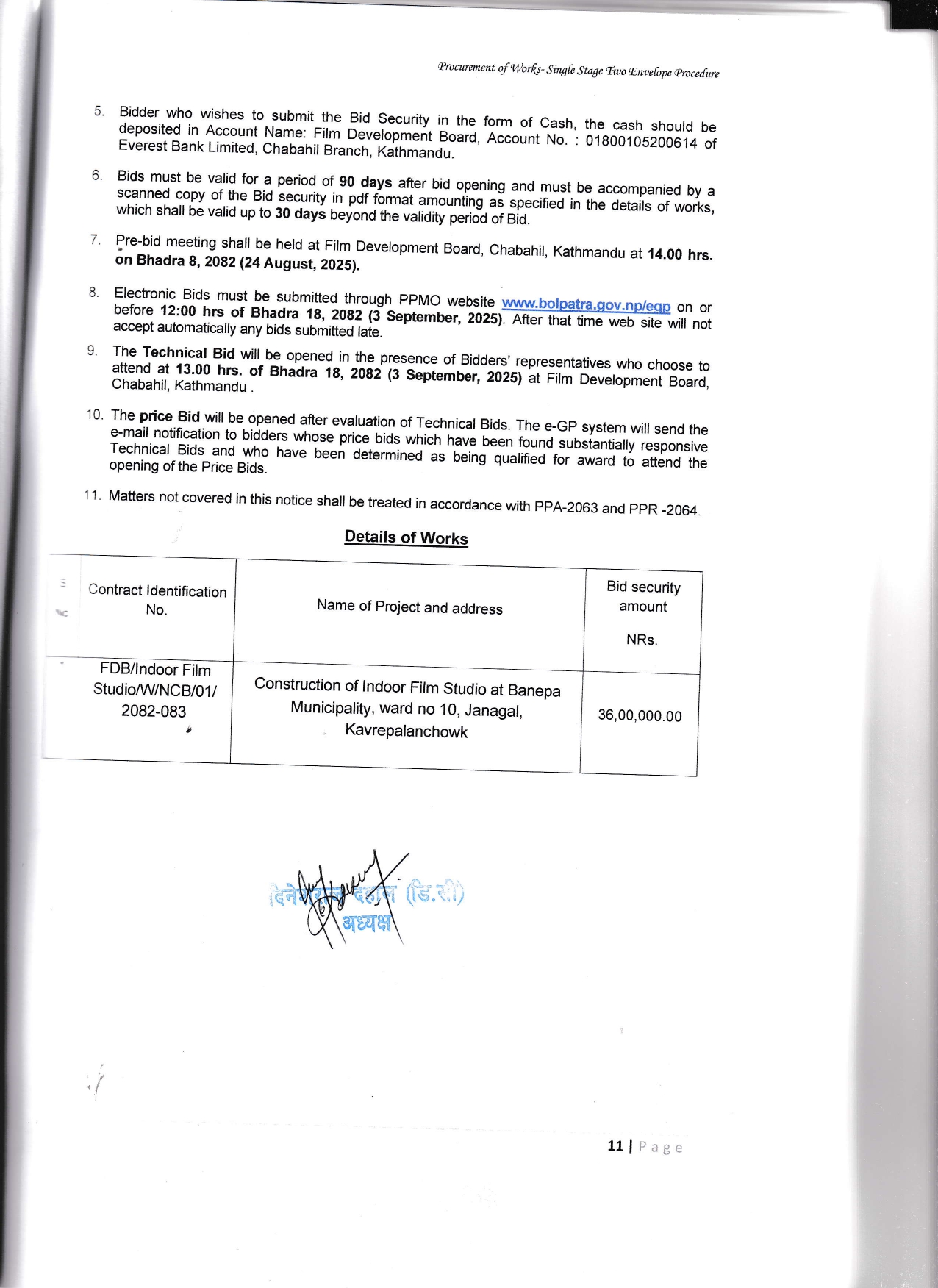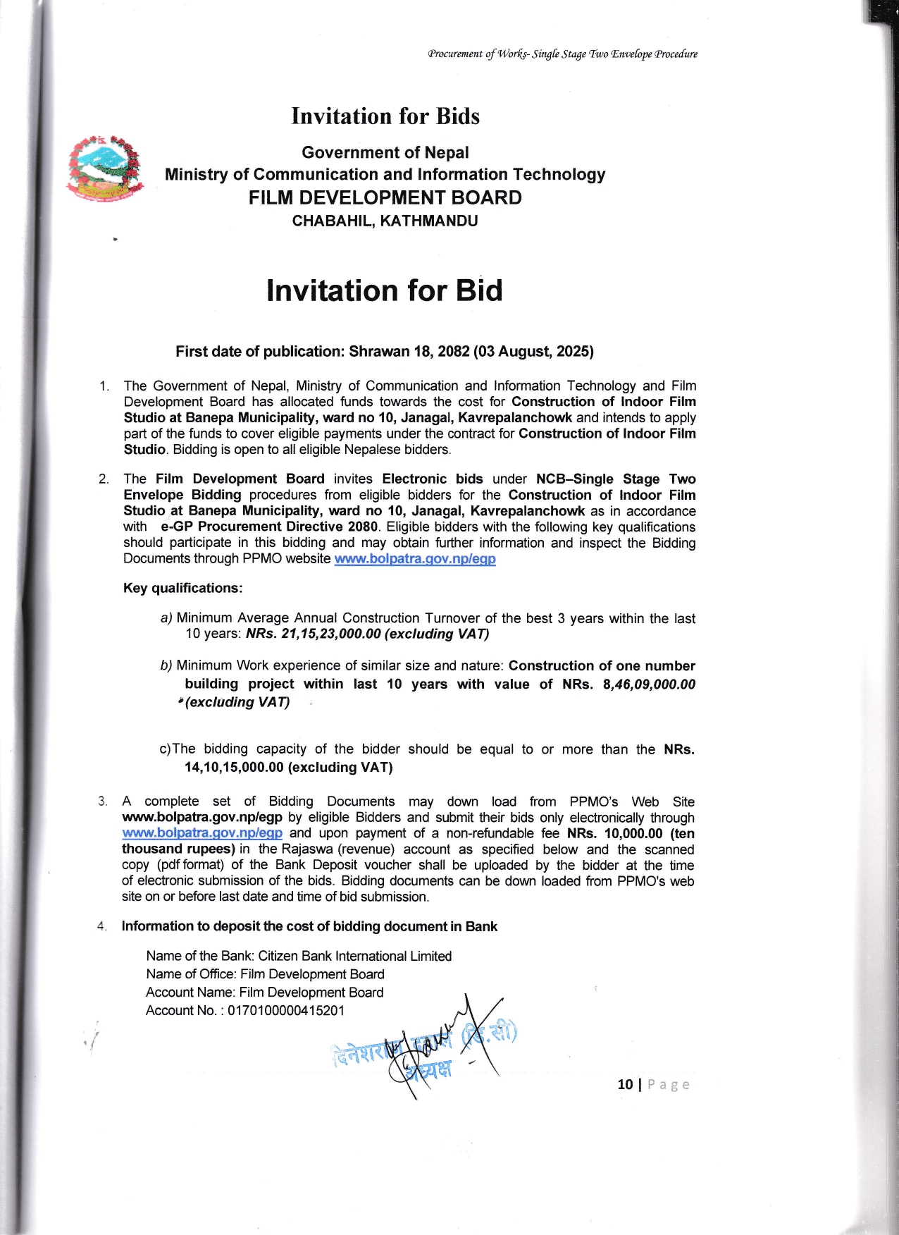 Invitation for Bids (E-bidding) for Construction of Indoor Film Studio at Banepa Municipality, Ward no 10, Janagal, Kavrepalanchowk (Shrawan 18 2082 (3rd August 2025))