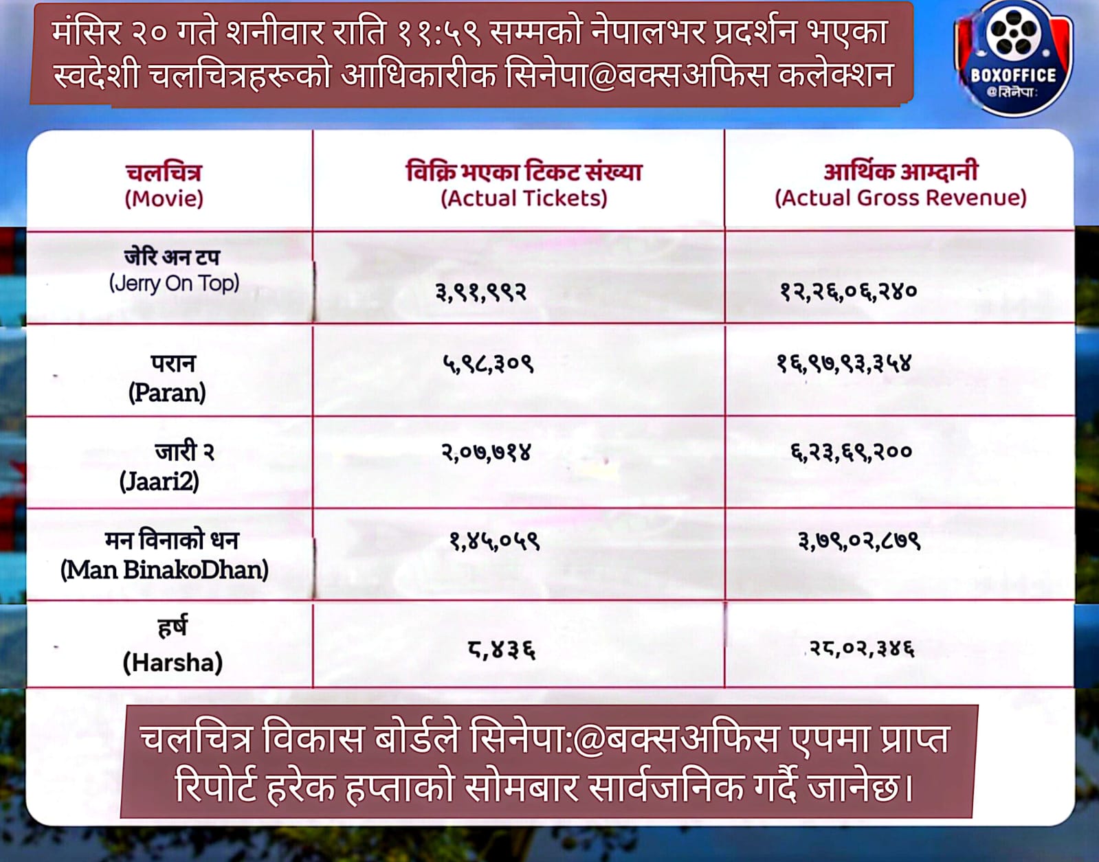 | साप्ताहिक बक्स अफिस रिपोर्ट – मिति २०८२ मंसिर २० गते शनिबार, ११ः५९ राति सम्मको आधिकारिक बक्स अफिस रिपोर्ट @सिनेपाः, बक्सअफिस कलेक्सन