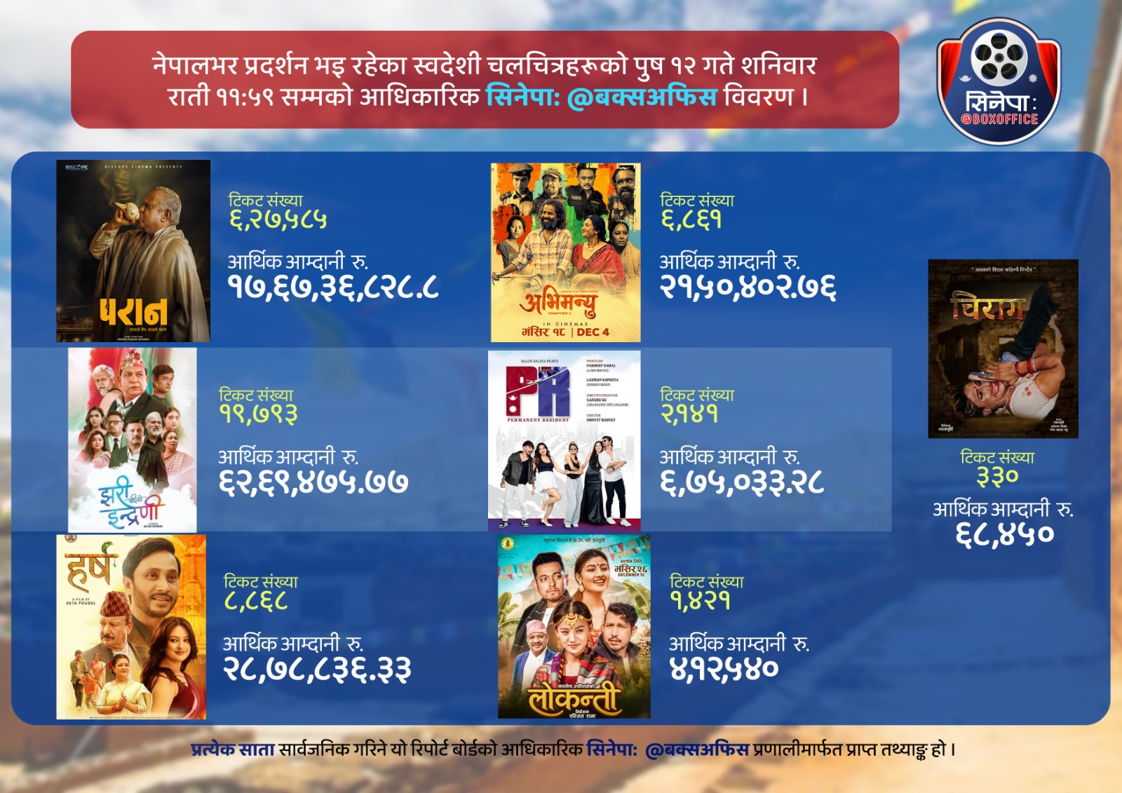 | साप्ताहिक बक्स अफिस रिपोर्ट – मिति २०८२ पुष १२ गते शनिबार, ११ः५९ राति सम्मको आधिकारिक बक्स अफिस रिपोर्ट @सिनेपाः, बक्सअफिस कलेक्सन