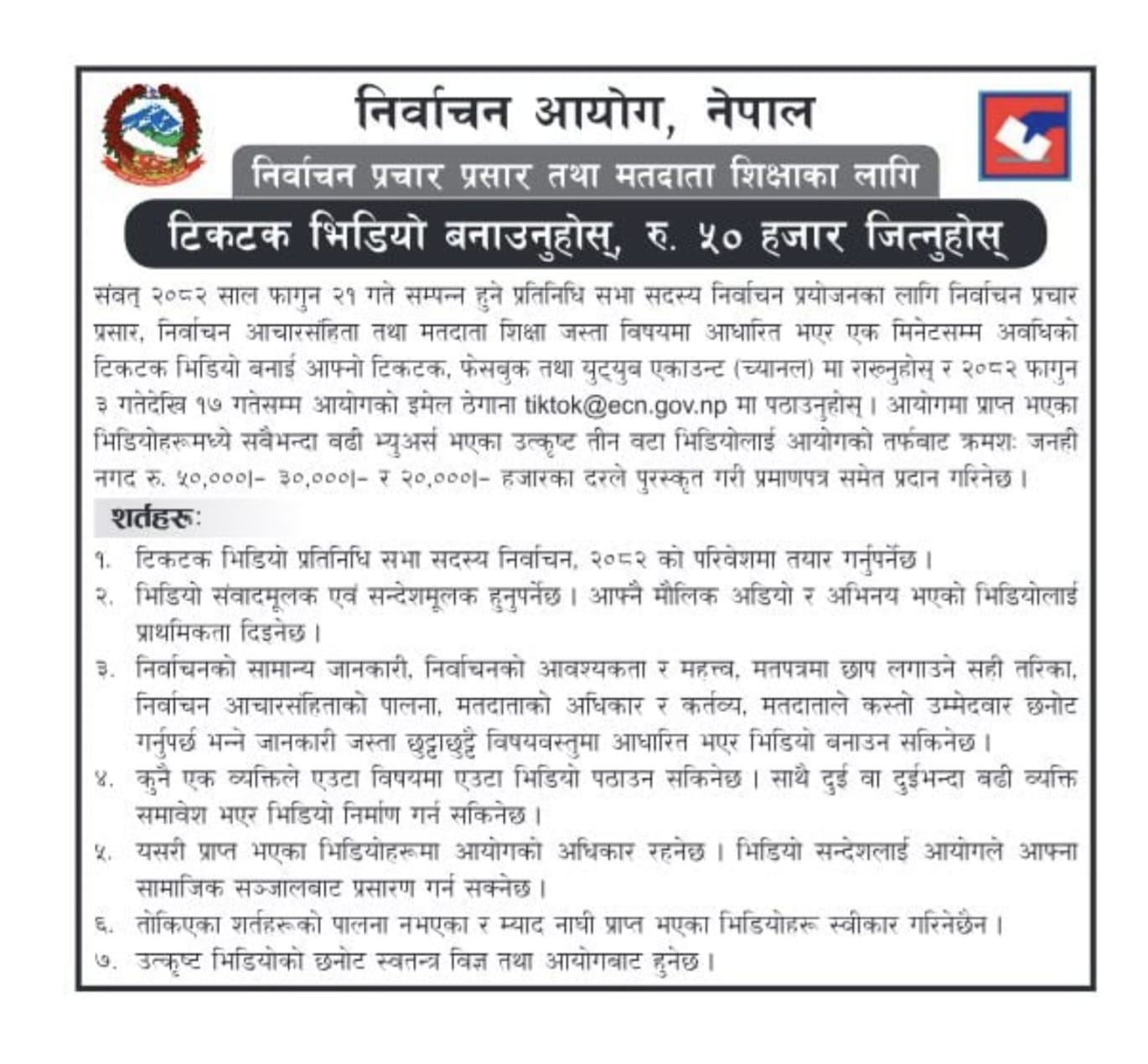 निर्वाचन प्रचार प्रसार तथा मतदाता शिक्षाको लागि टिकटक प्रतियोगीता सम्बन्धित सुचना