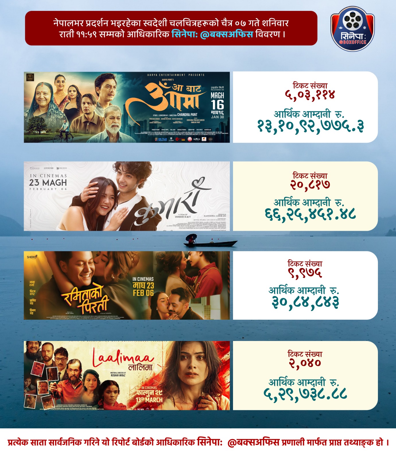 | साप्ताहिक स्वदेशी चलचित्रको बक्स अफिस रिपोर्ट – मिति २०८२ चैत्र ०७ गते शनिबार, ११ः५९ राति सम्मको आधिकारिक बक्स अफिस रिपोर्ट सिनेपाः@ बक्सअफिस कलेक्सन