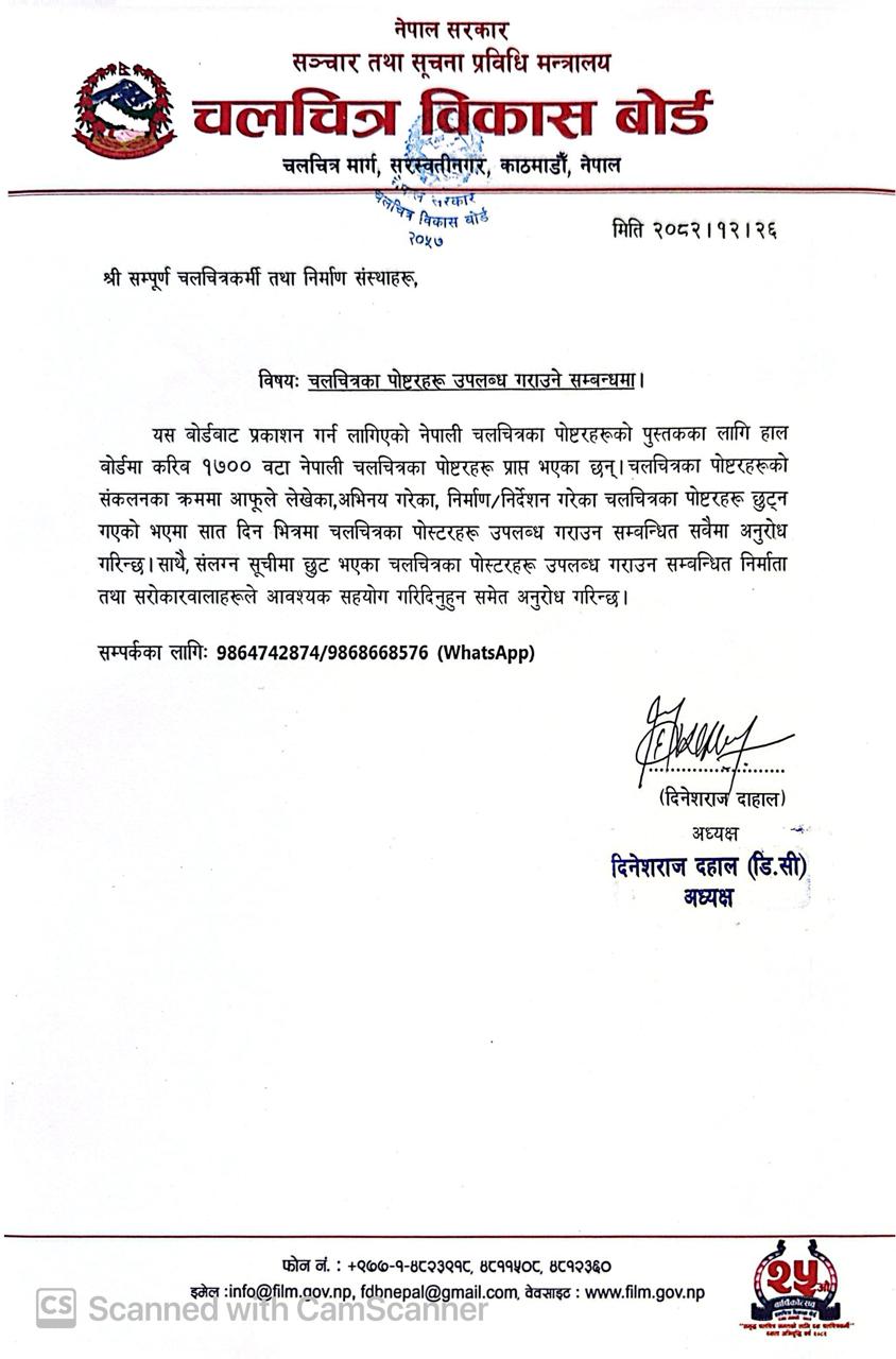 यस बोर्डबाट प्रकाशन गर्न लागिएको नेपाली चलचित्रका पोष्टरहरूको पुस्तकका लागि हाल बोर्डमा करिब १७०० वटा नेपाली चलचित्रका पोष्टरहरू प्राप्त भएका छन्।चलचित्रका पोष्टरहरूको संकलनका क्रममा आफूले लेखेका,अभिनय गरेका, निर्माण/निर्देशन गरेका चलचित्रका पोष्टरहरू छुट्न गएको भएमा सात दिन भित्रमा चलचित्रका पोस्टरहरू उपलब्ध गराउन सम्बन्धित सबैमा अनुरोध गरिन्छ।साथै, संलग्न सूचीमा छुट भएका चलचित्रका पोस्टरहरू उपलब्ध गराउन सम्बन्धित निर्माता तथा सरोकारवालाहरूले आवश्यक सहयोग गरिदिनुहुन समेत अनुरोध गरिन्छ।