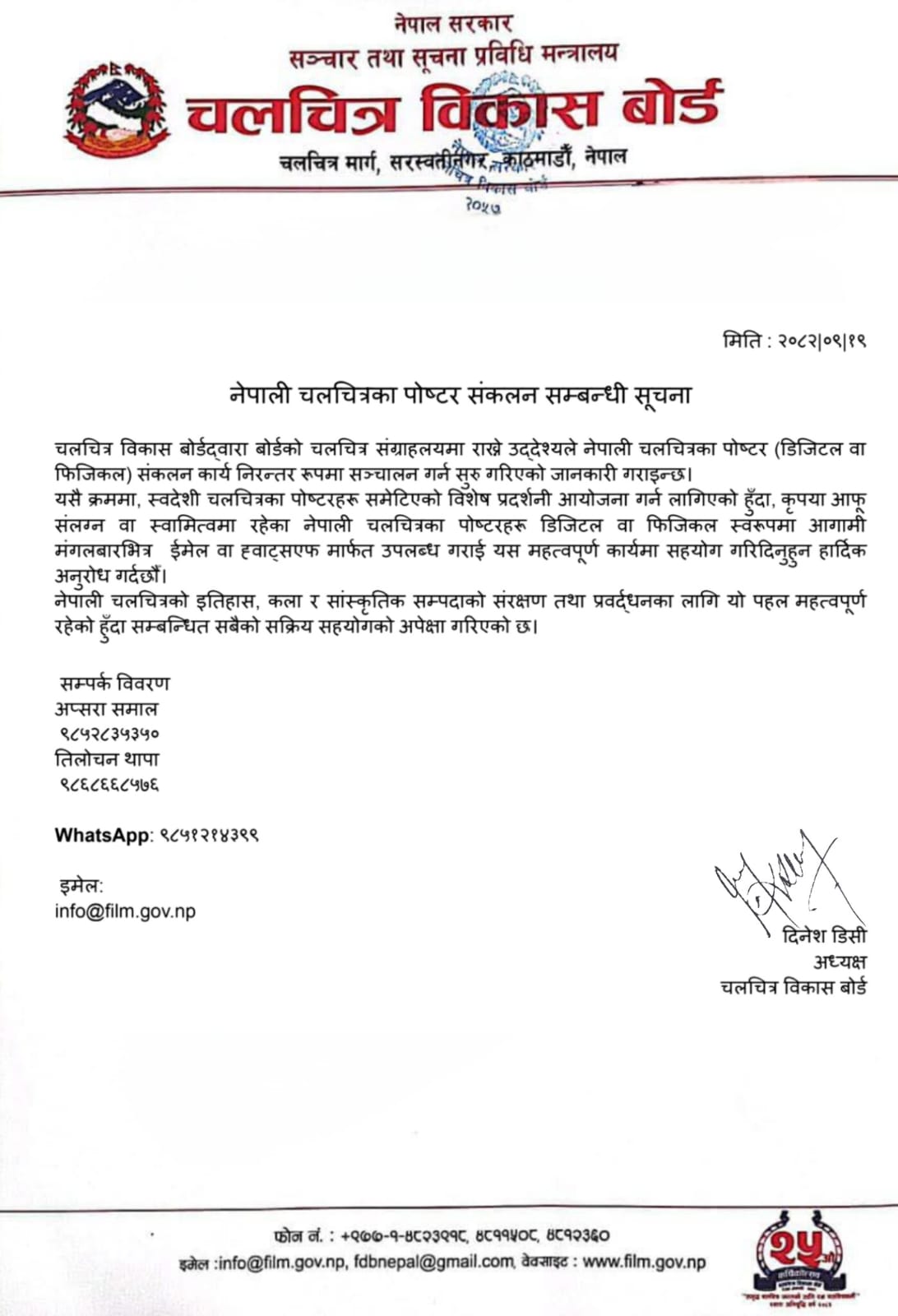 बोर्डले सम्बन्धित सबै चलचित्रकर्मी तथा अधिकार प्राप्त व्यक्तिहरूलाई आगामी मंगलबारभित्र आफू संलग्न चलचित्रका पोष्टरहरू डिजिटल वा फिजिकल स्वरूपमा उपलब्ध गराई यस महत्वपूर्ण कार्यमा सहयोग गर्न आग्रह गरेको छ।